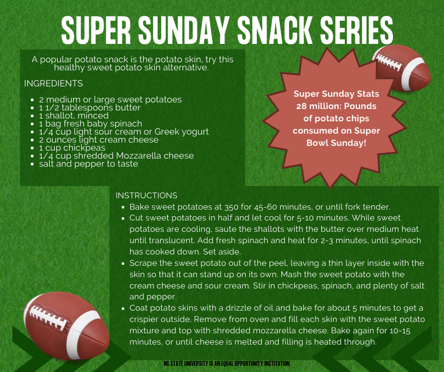 If you have any questions or need more Super Snack Sunday ideas, don't hesitate to get in touch with Sarah Sowders at shesing@ncsu.edu or at (252) 426-5428